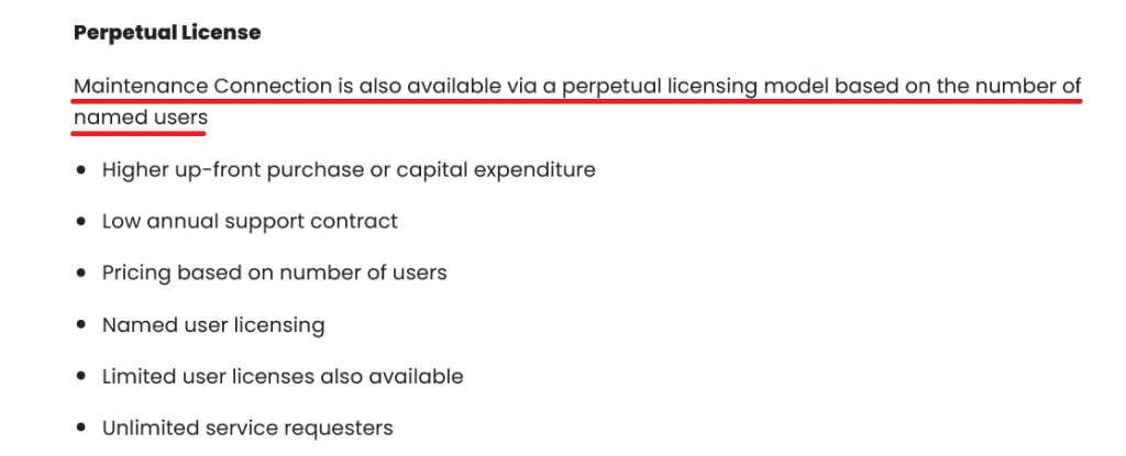 Another CMMS vendor that supports perpetual licensing is Maintenance Connection, which allows buyers to run the software without a subscription.