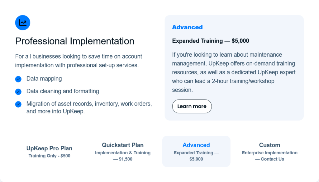 This includes data mapping, cleaning, and migration for assets, inventory, and work orders, which is useful if you’re transitioning from another system but definitely something to budget for in advance.