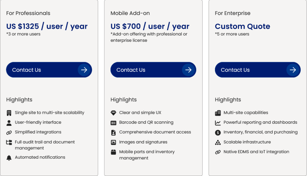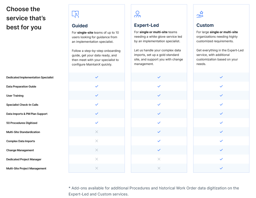 They also offer optional add-ons for historical work order data digitization on Expert-Led and Custom plans.
