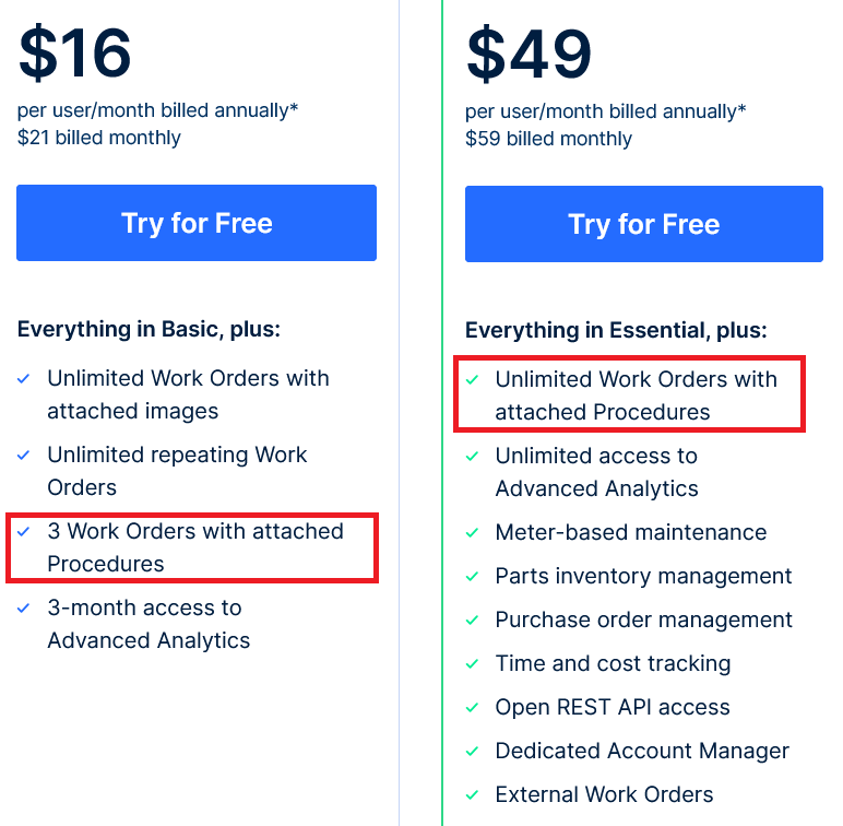 Their Essential plan includes only three repeating work orders with attached procedures.