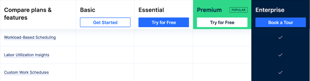 Key capabilities like meter-based scheduling and a public request portal are locked behind the Premium and Enterprise tiers.