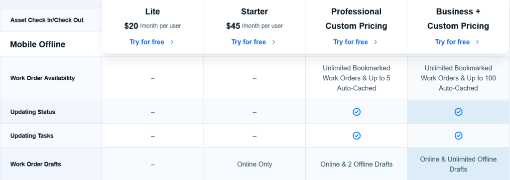 For instance, a plan for a field technician who only logs work orders costs less than one for a maintenance supervisor who manages reports and asset histories.