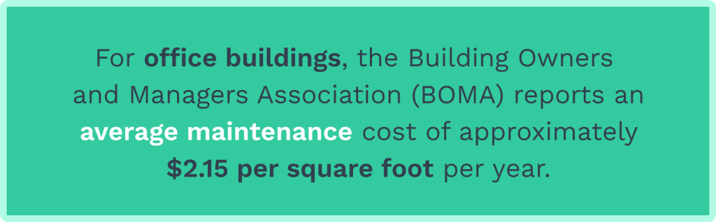 Retail properties typically cost $1.50 to $2.00 per square foot annually for maintenance, while office buildings or industrial spaces may have different cost structures.