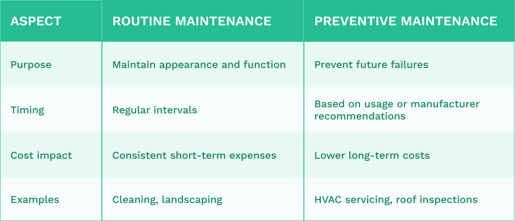 Routine maintenance addresses regular upkeep needs, including cleaning, landscaping, and basic repairs. These tasks maintain the day-to-day functionality and appearance of the property.