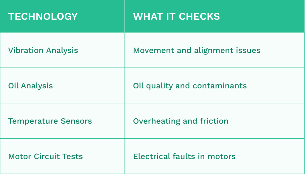 Some common technologies include vibration analysis, oil analysis, temperature sensors, and motor circuit analysis.