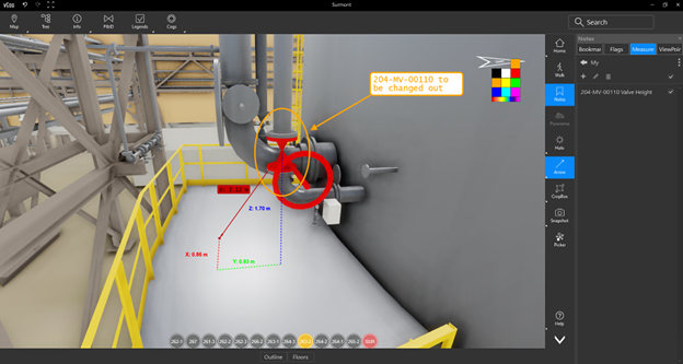 Their technicians now use the system to locate misplaced equipment, leave maintenance notes (as shown below), plan scaffolding, and estimate heights and distances for crane operations.