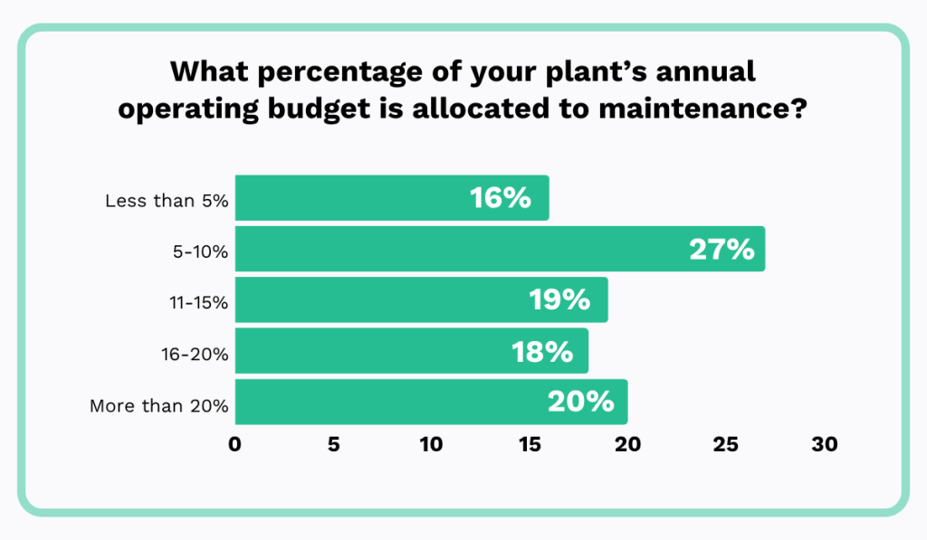 When asked what percentage of their plant’s annual operating budget goes to maintenance, nearly two-thirds said it falls within the 5–20% range.