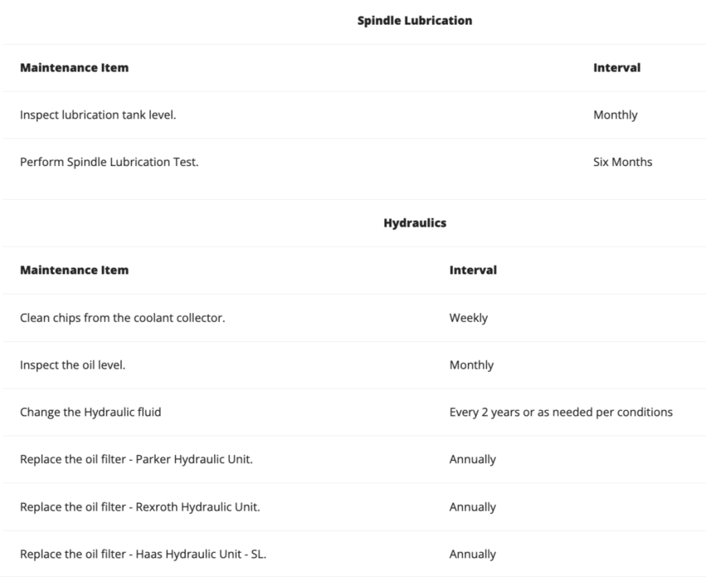 Their lathe manuals include detailed upkeep schedules, outlining the upkeep frequency and specific tasks required for each component: