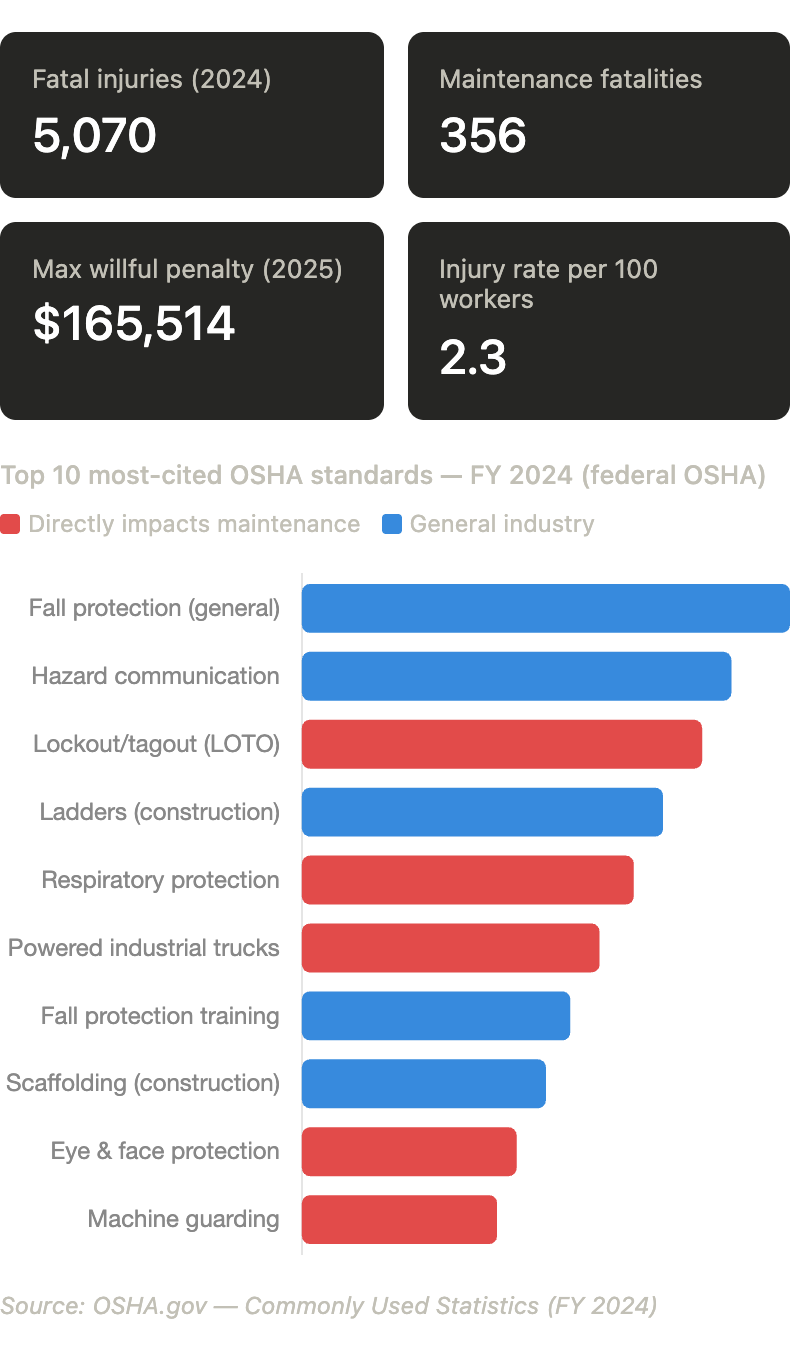 • Lockout/tagout (LOTO) is consistently among the top three most-cited OSHA violations in maintenance operations.