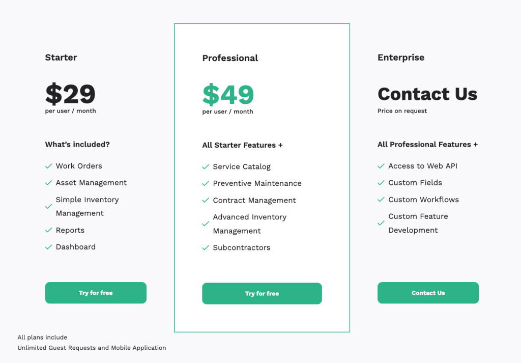 WorkTrek: Subscription-based with transparent and affordable plans. Starter at $29/user/month and Professional at $49/user/month (Enterprise plan is custom). The Starter includes core CMMS features (work orders, asset mgmt, basic inventory, reports). At the same time, the Professional plan adds preventive maintenance scheduling, a service catalog, contracts, and advanced inventory. All plans include mobile app usage.
