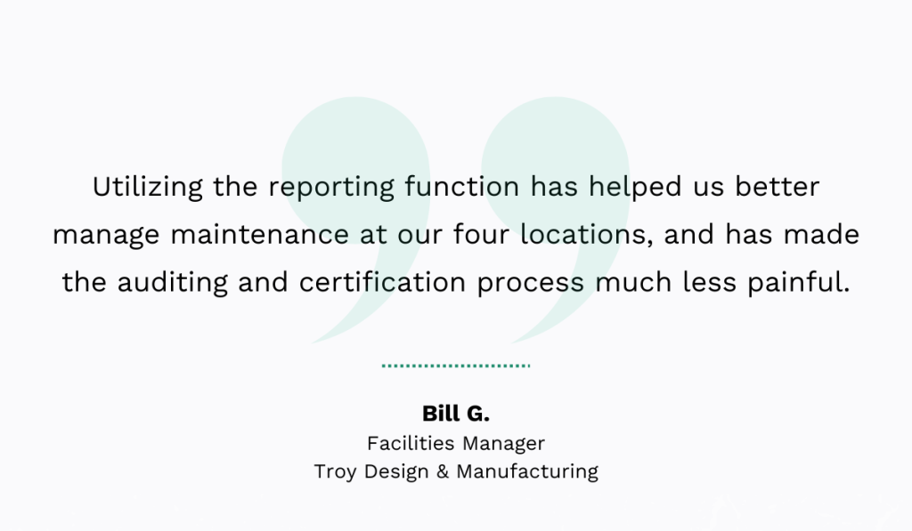 According to Bill G., the facilities manager, the system has proven invaluable across their four facilities with its centralized records and user-friendly reporting capabilities.