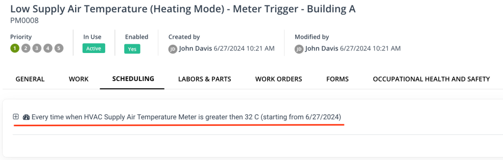 Alternatively, meter-based scheduling ensures maintenance is performed according to specific usage parameters, including operating hours, mileage, temperature fluctuations, or pressure thresholds:
