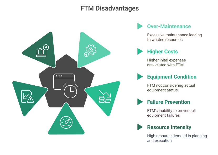 However, the approach isn’t without its drawbacks. Organizations may face challenges with over-maintenance and unnecessary parts replacement, leading to higher short-term costs than reactive maintenance. Since FTM doesn’t account for actual equipment conditions, it may not prevent all failures and can be resource-intensive in planning and execution.